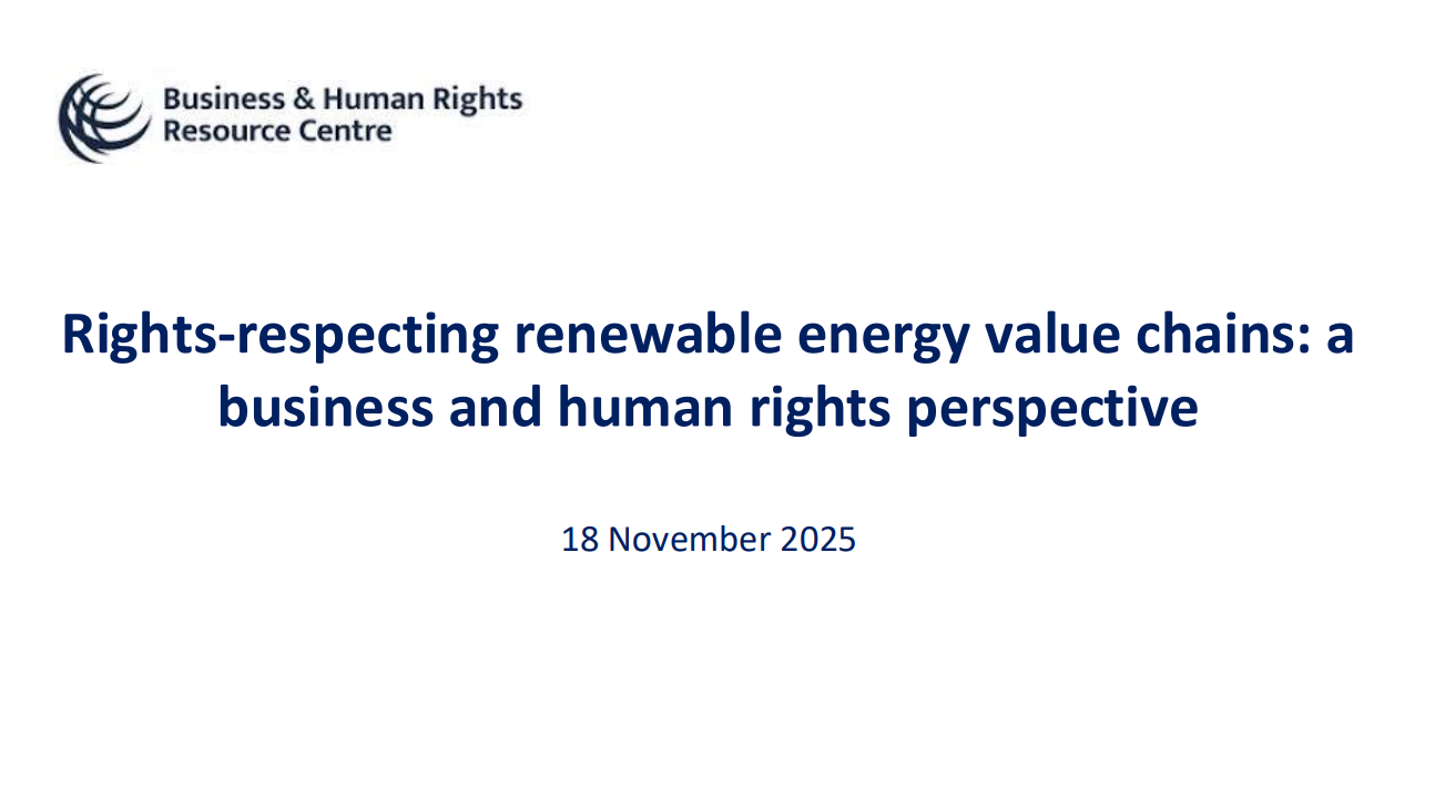 Presented in the online workshop, ‘Shared Prosperity,’ as part of the Pathways to Shared Prosperity collaboration between the BHRRC, INSPIRE and the JustRE Alliance. This presentation shares insights from BHRRC on the benchmarking of wind and solar companies and research on social performance and human rights in renewable energy in the context of partnerships with Indigenous Peoples.
